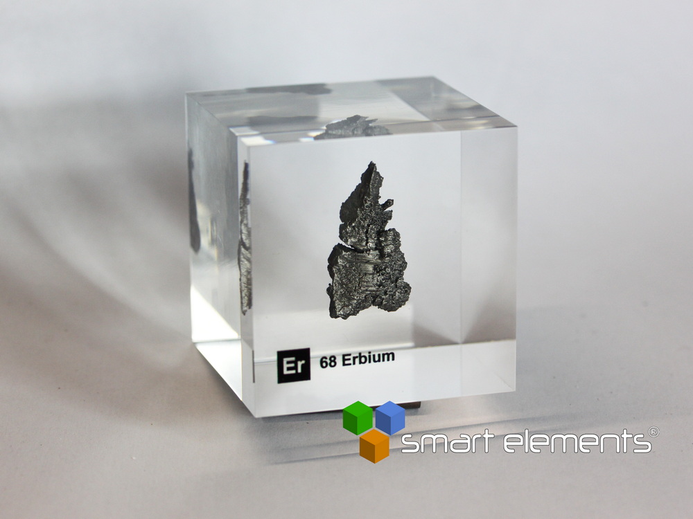 Erbiummetall, Stücke eingebettet in 50mm klaren Acrylwürfel
