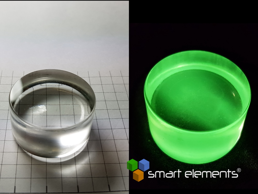 Diameter~ 40mm – height ~ 16mm – weight ~ 35 grams – Material: BaP: Tb3+ 0.3 mol%