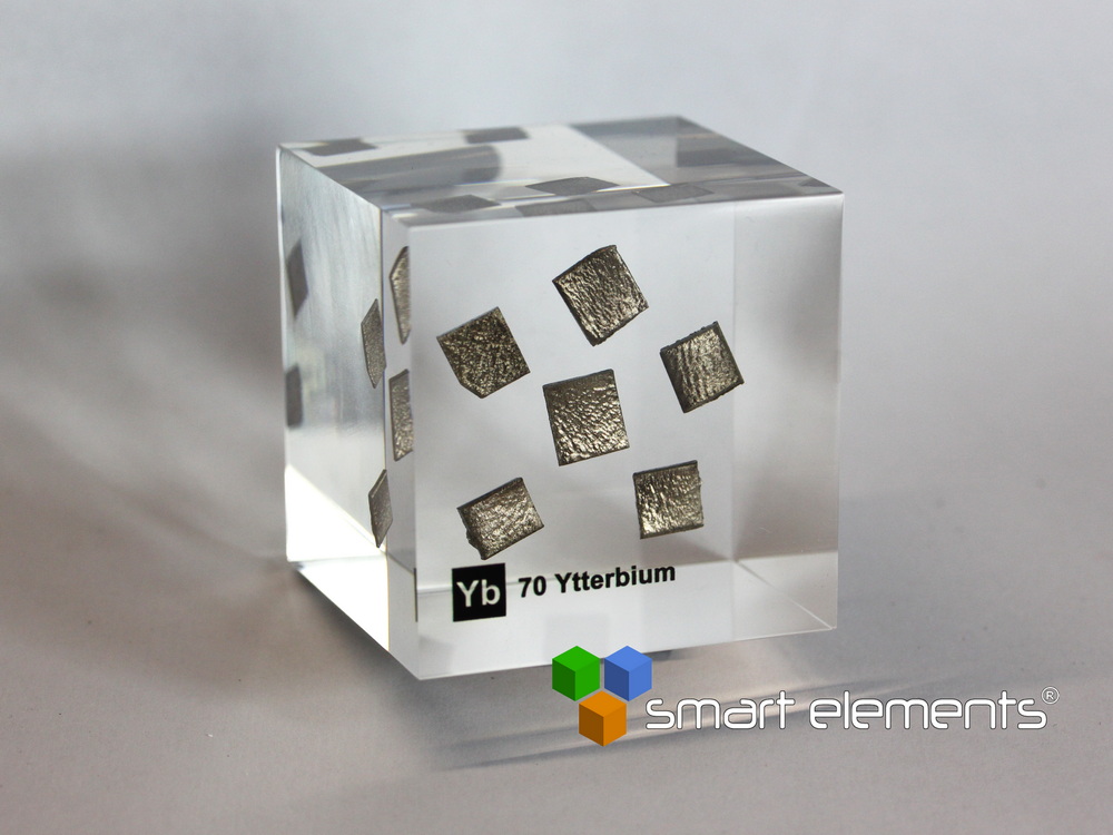 Ytterbium Yb – high purity pieces 99.99% purity in 50mm acrylic cube