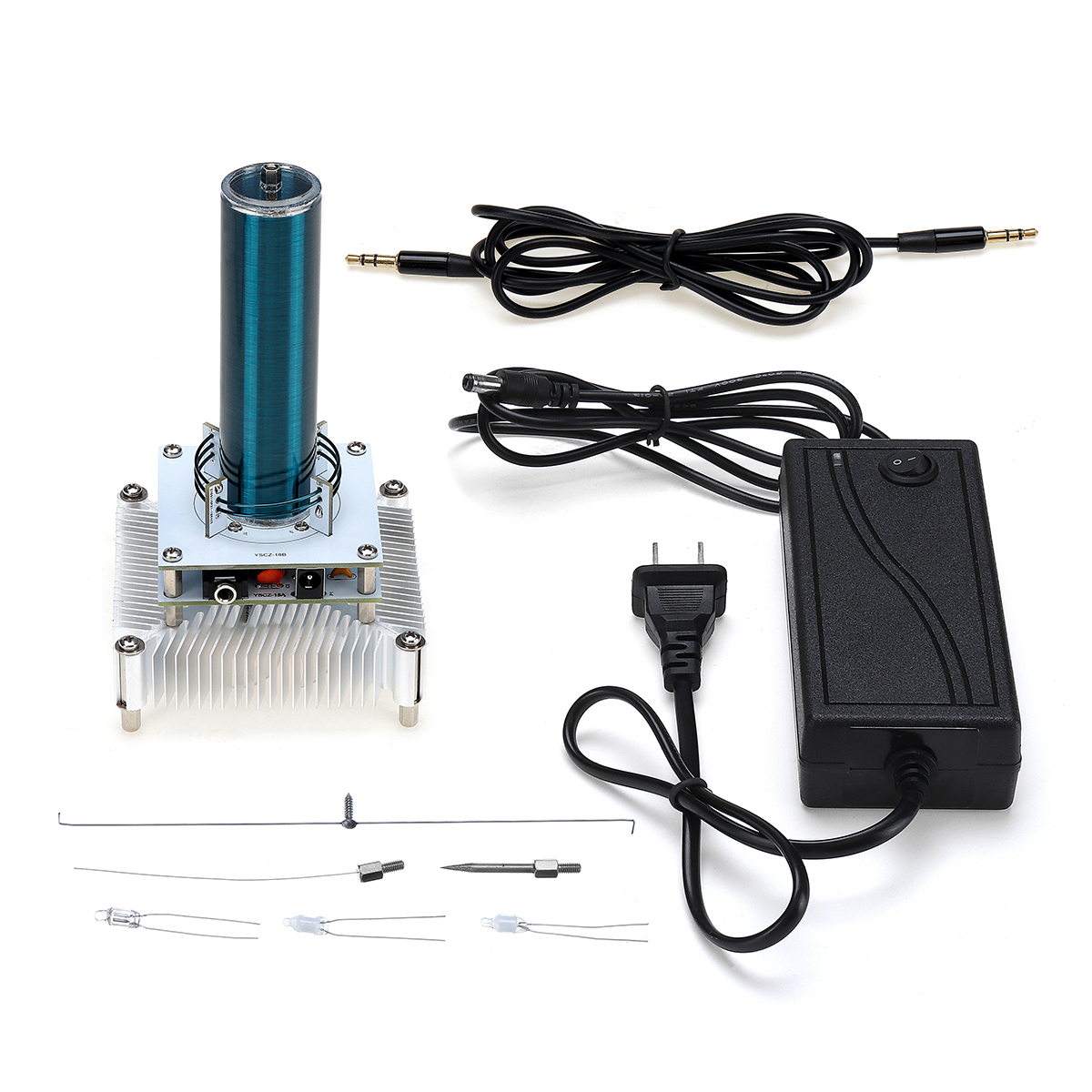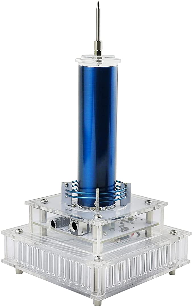 - It lights up all kind of discharge tubes or lamps and even LED just by holding the tube or lamp near the coil. At the same time, this Tesla coil adds audio modulation to the circuit, so when a music signal is input, the arc will emit music sound and become a plasma loudspeaker. The top of this coil is designed with different discharge terminals which can be replaced, thus achieving the effect of ion wreath of ion windmill.