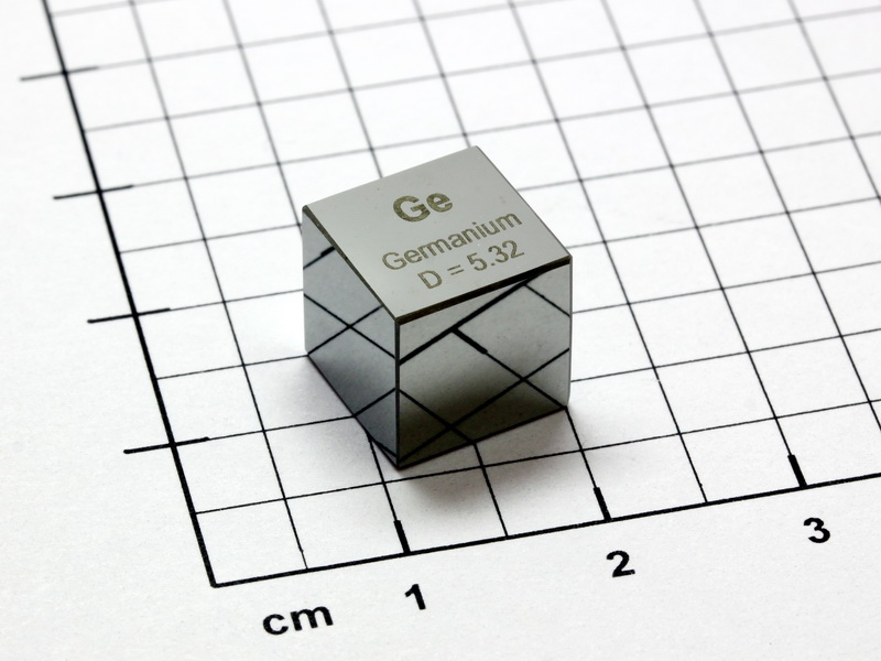 Germanium – monocrystalline 99.999% – Precision density-standard cube 1cm3 NEW! Shiny polished, laser engraved.