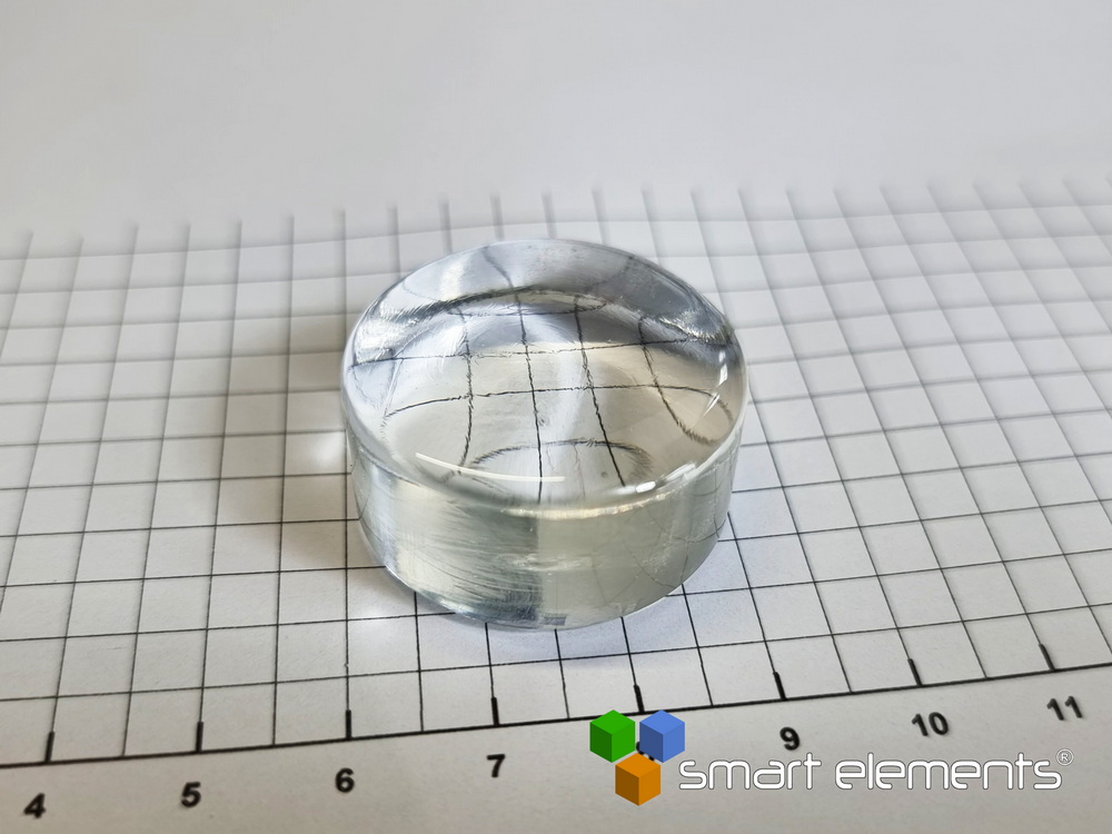 Diameter: 30mm – height ~ 15mm  – weight ~ 30 – 32 grams – Material: LuKP glass  Lu2O3 17 mol%