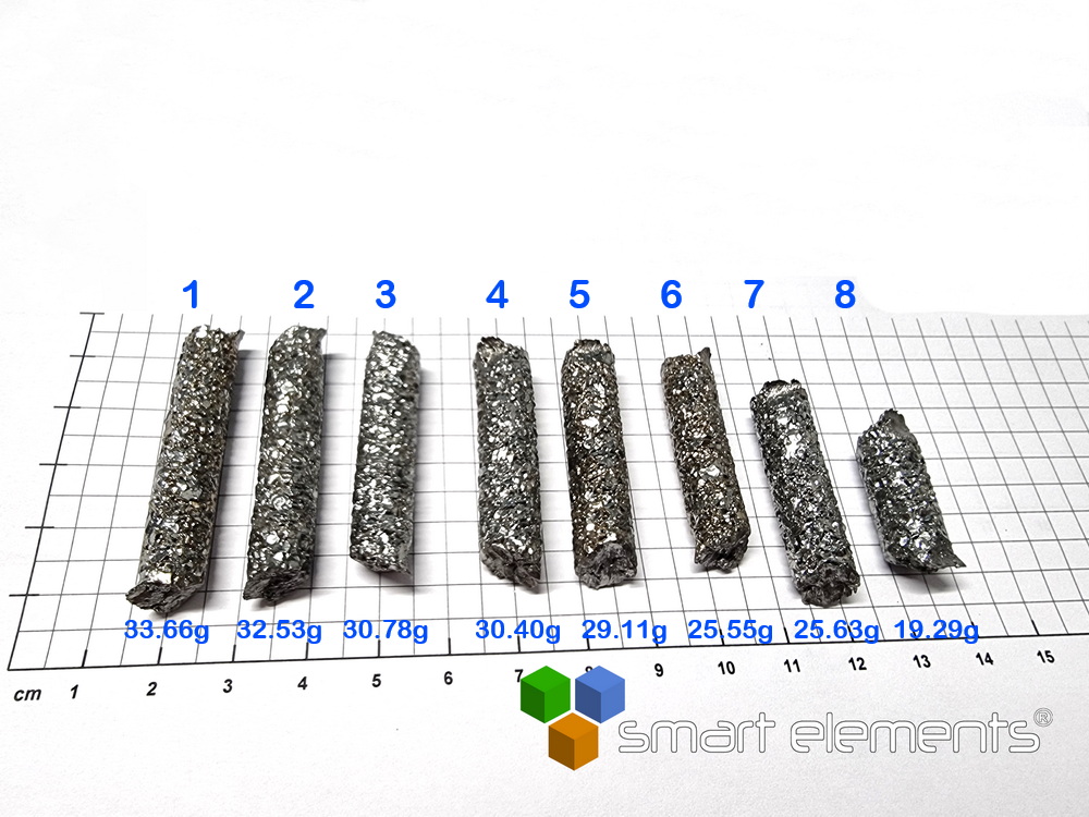 Theserare and small Hafnium Crystal Bar was created by a power outage at the manufacturer, so the procedure had to be stopped and it resulted in beautiful miniature Crystal Bars with stunning diamond-shining crystals on the surface
