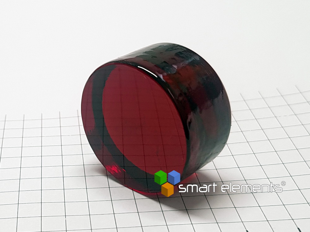 This new developed Hafnium (3 mol%) + sulfur doped red borate glass has interesting characteristics like deep red color (650nm transmission) and an emission @ 738nm under UV excitation (365nm). This glass does not contain Cadmium, Selenium or Arsenic.