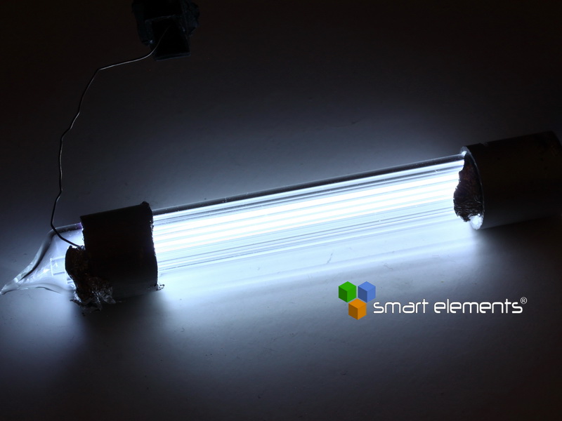 This new discharge tube is a redevelopment of our luminescent ampoules and offers the benefits of a metal-free ampoule with the luminosity of a commercial spectrum tube. In this tube, the excited gas has to pass through many small capilaries and is forced to particularly strong shine. Good contact between the external electrodes around the ampoule is required.